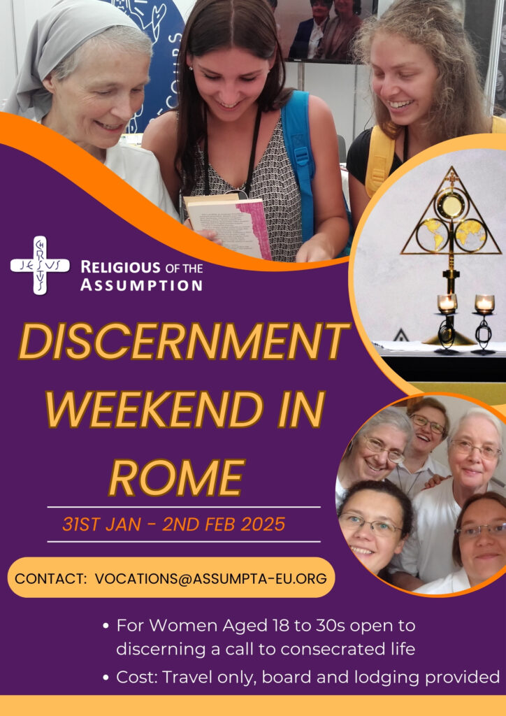 To celebrate the Jubilee Year 2025, the Religious of the Assumption are inviting single women (18-30s) open to discerning a call to consecrated life to take part in a discernment weekend in Rome. This will take place from Friday 31st January to Sunday 2nd February, enabling participants to celebrate February 2nd, the Feast of the Presentation of the Lord and the World Day of Prayer for Consecrated Life, in Rome!
