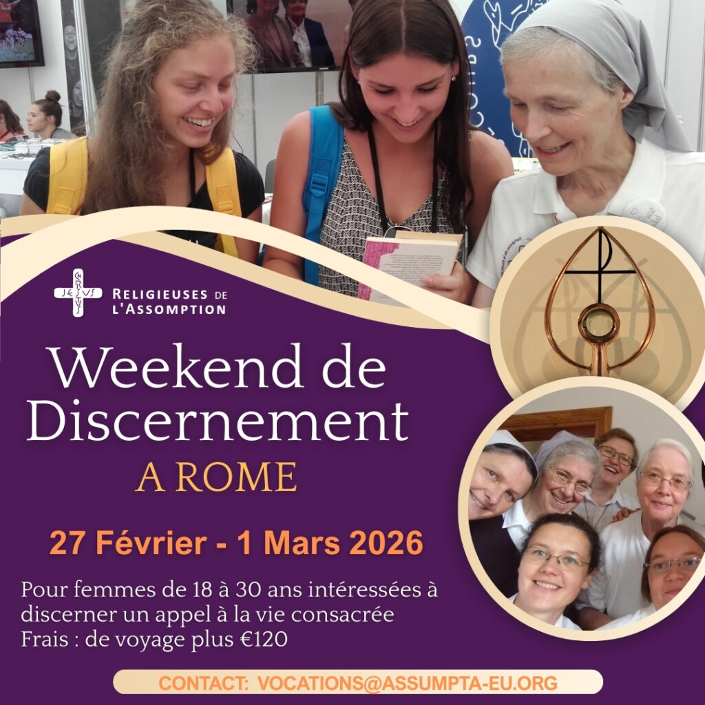 Après un week-end de discernement très réussi à Rome l’année dernière, les Religieuses de l’Assomption proposent un autre rendez-vous cette année, du 27 février au 1er mars, ouvert aux femmes de 18 à 30 ans. Ce sera une occasion excellente pour prier, pour réfléchir, pour rencontrer des sœurs et d’autres femmes en discernement, et pour visiter quelques-uns des sites spectaculaires de Rome ! Les frais s’élèvent à €120.