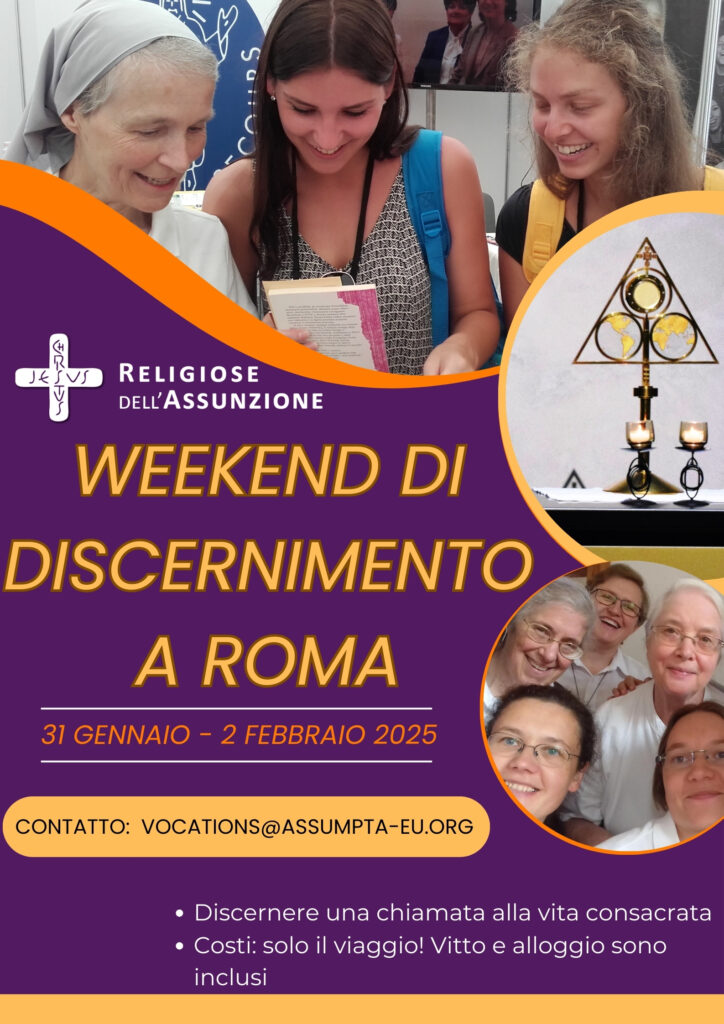 Per celebrare l’anno giubilare 2025, le Religiose dell’Assunzione invitano giovani donne (18-39), aperte al discernimento della chiamata alla vita consacrata, a partecipare a un weekend di discernimento a Roma. Si svolgerà da venerdì 31 gennaio a domenica 2 febbraio, consentendo alle partecipanti di celebrare, il 2 febbraio, la festa della Presentazione del Signore e Giornata mondiale di preghiera per la vita consacrata.