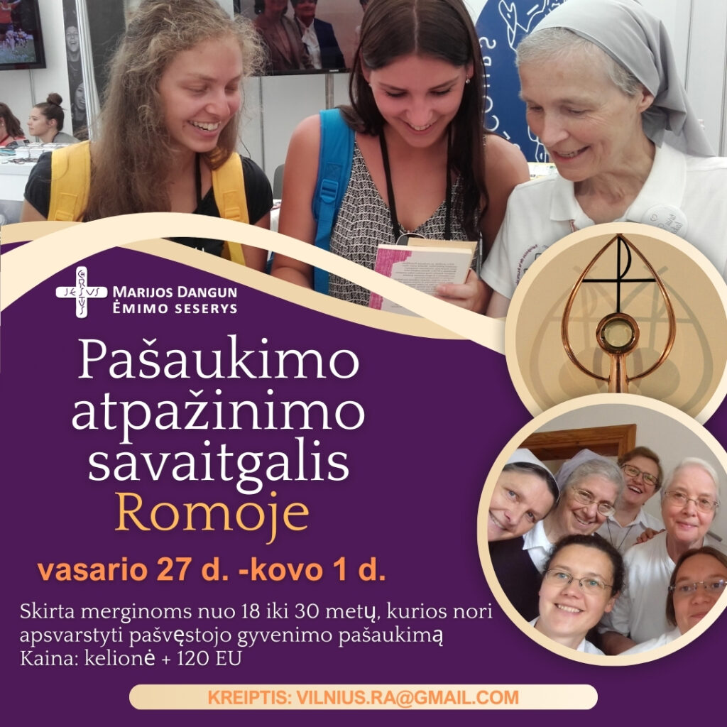 Po labai sėkmingo praėjusių metų įžvalgų savaitgalio Romoje vienuoliai nusprendė šiemet vasario 27-kovo 1 d. surengti dar vieną savaitgalį, skirtą 18-30 metų amžiaus moterims. Tai bus puiki proga melstis, apmąstyti, susitikti su seserimis ir kitomis įžvalgomis bei pamatyti nuostabias Romos įžymybes! Kelionės ir € 120.
