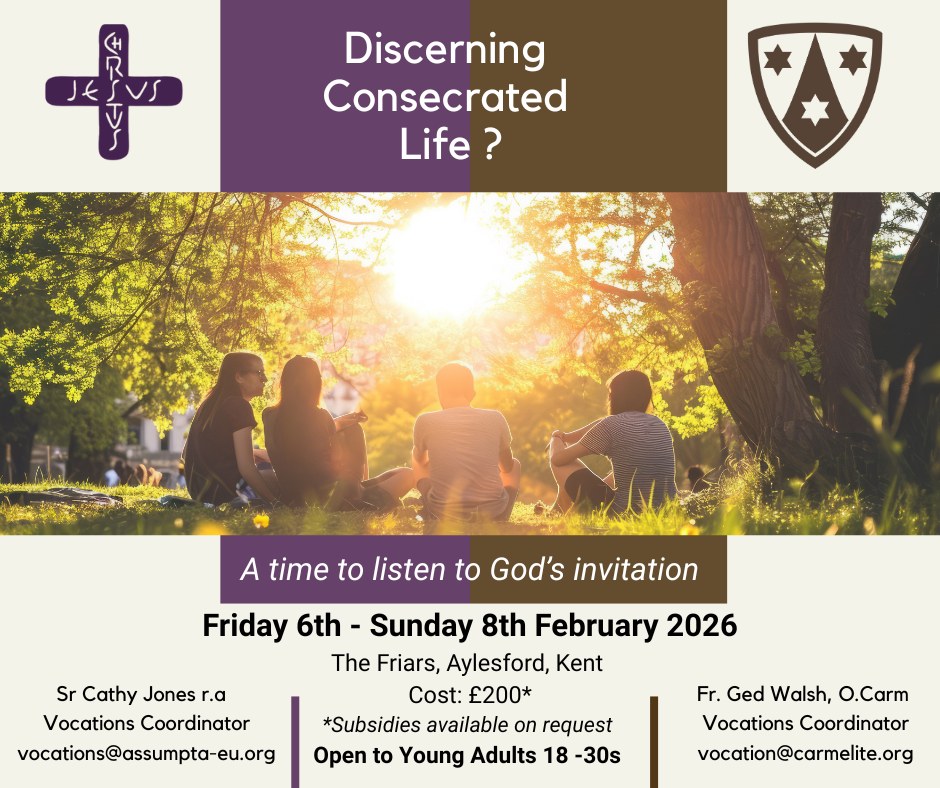 Another discernment weekend, for both men and women (aged 18-30s), is taking place at Aylesford Abbey from 6th-8th February, run by the Carmelites at Aylesford and the Religious of the Assumption. The cost is £200, with subsidies available for students on request.